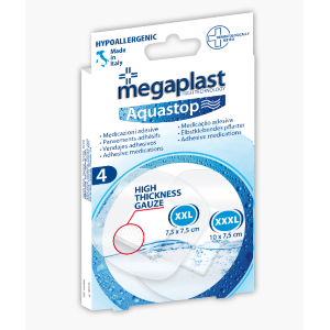 Cerotto adesivo resistente all’acqua per medicazione con garza ad alto spessore.
