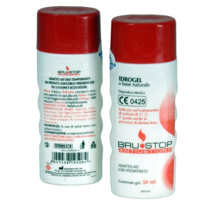 Flacone gel 50 ml antiustioni, ( Ministero della Salute nr. 1251622 classificazione CND M9099), adatto ad uso temporaneo di pronto soccorso premedicale su ustioni, scottature ed ustioni solari. Fornisce il necessario supporto d'acqua alla cute, raffredda e allevia il dolore. Minimizza i traumi da ustione e aiuta a prevenire le infezioni.